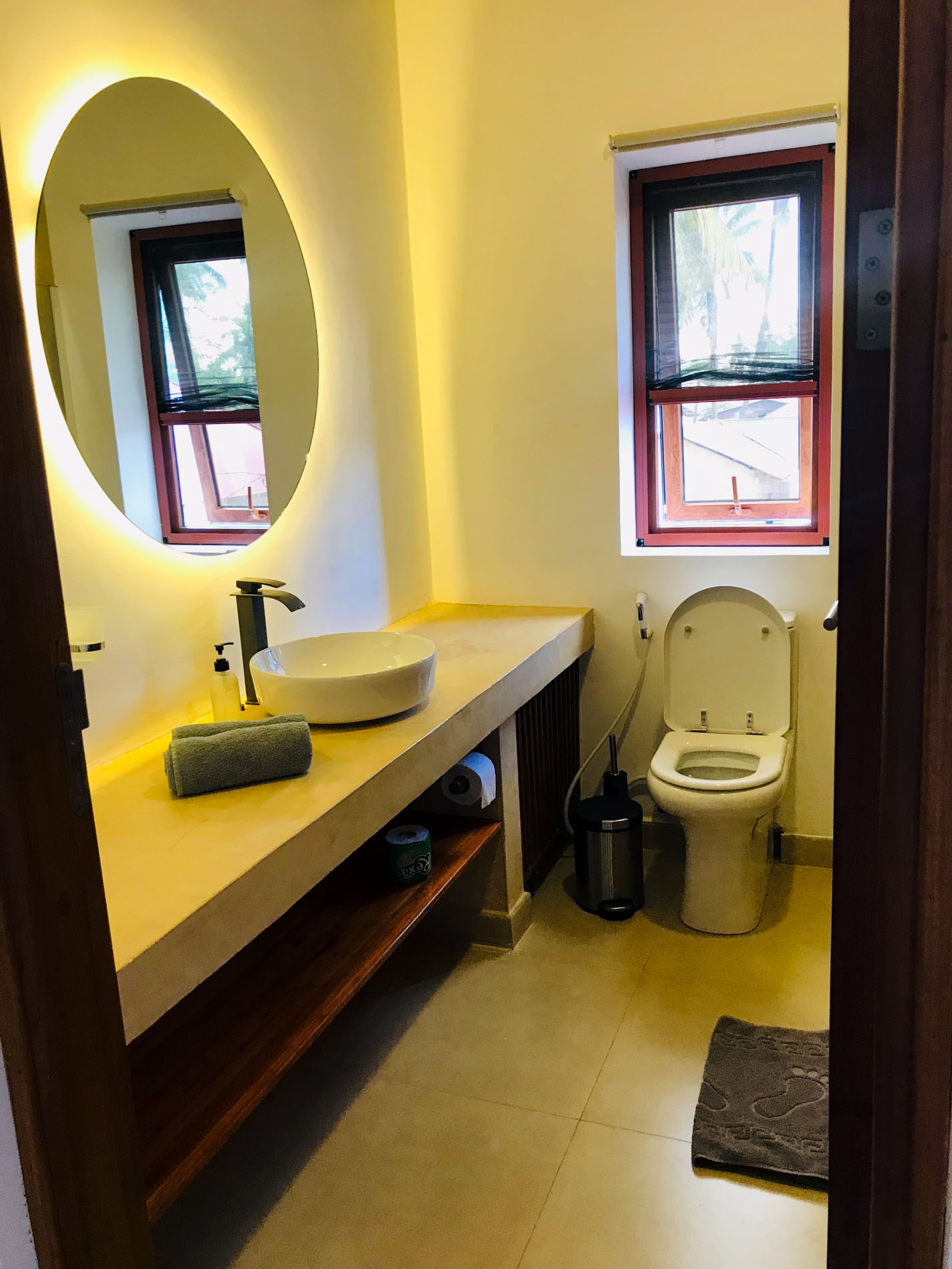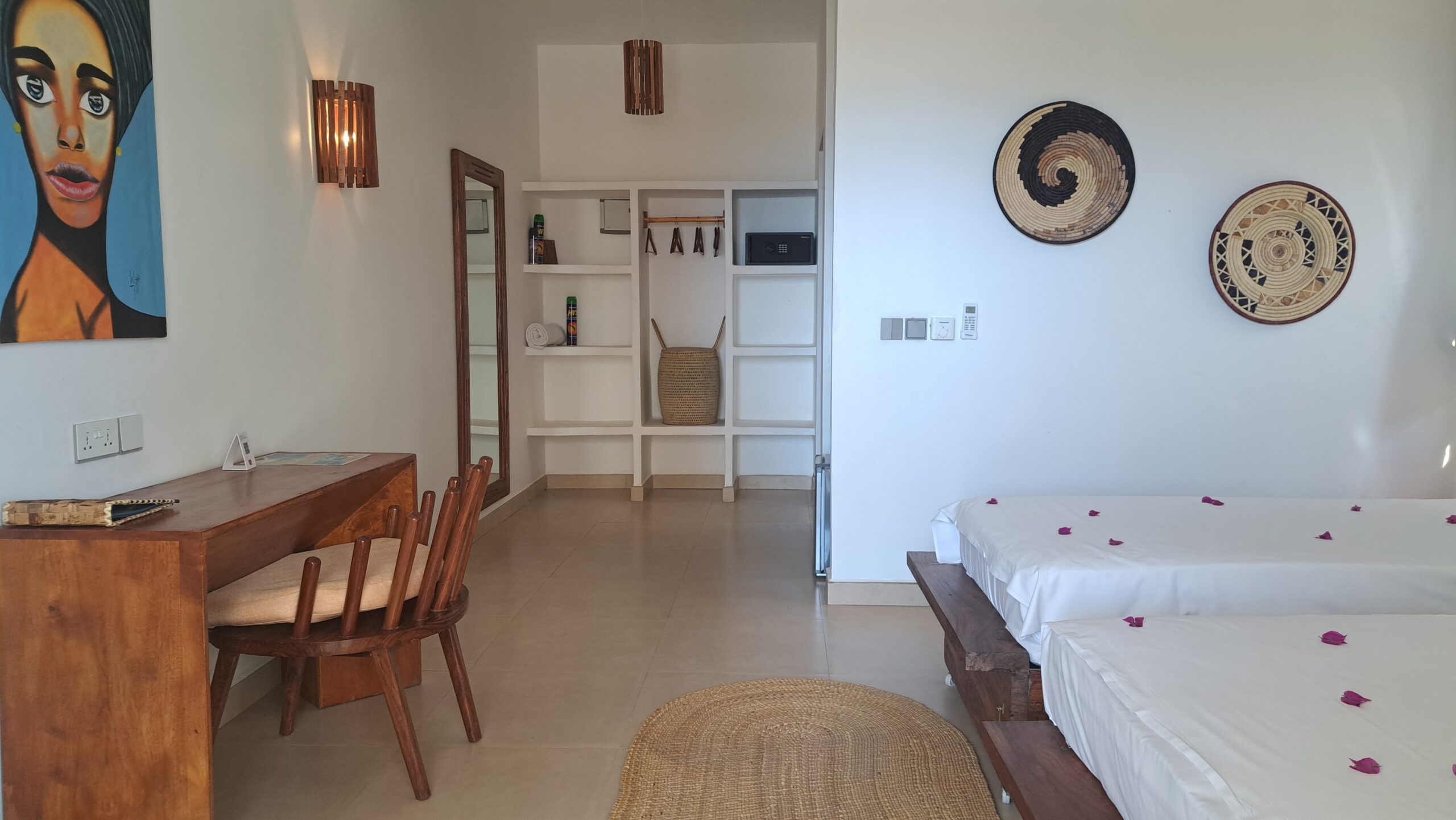 The spacious twin room (30 m2) offers 2 single beds (90 cm width) that can be combined, air conditioning, fan, a tea and coffee maker, a terrace with dining area and kitchenette surrounded by flowerbeds, as well as a private bathroom featuring a walk-in shower. All rooms have a safe deposit box and mosquito net and are accessible by stairs only. All rooms are non smoking.