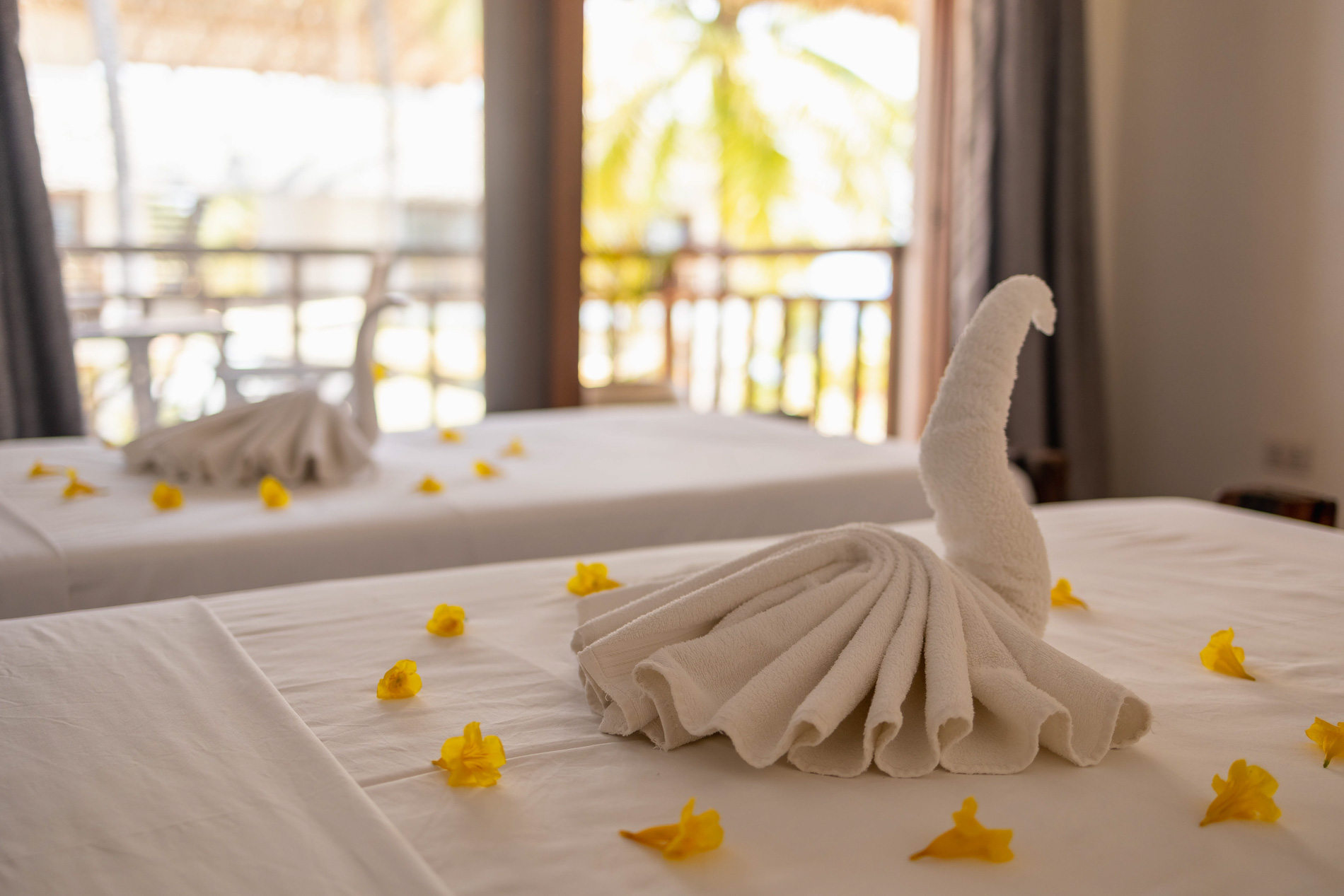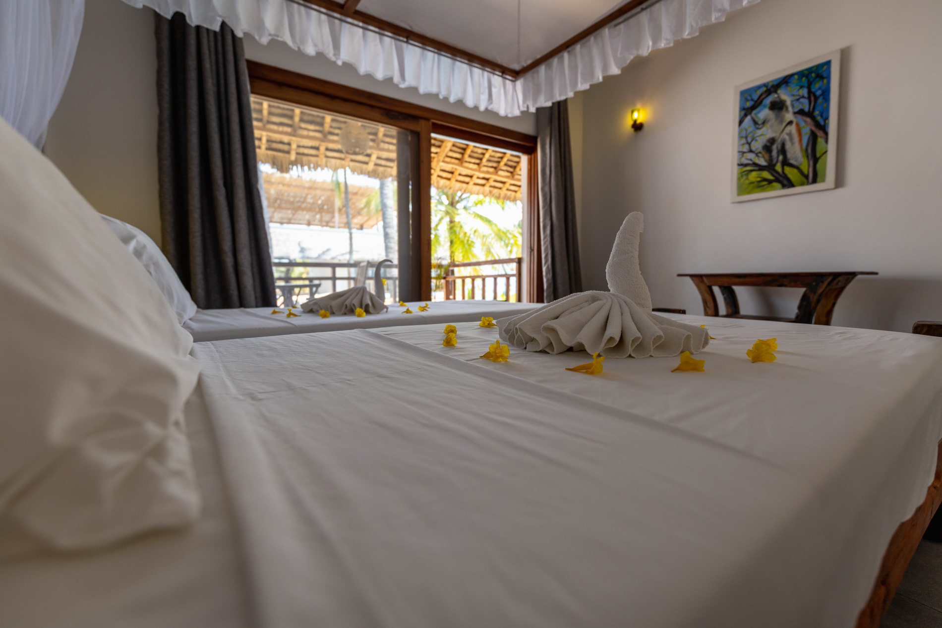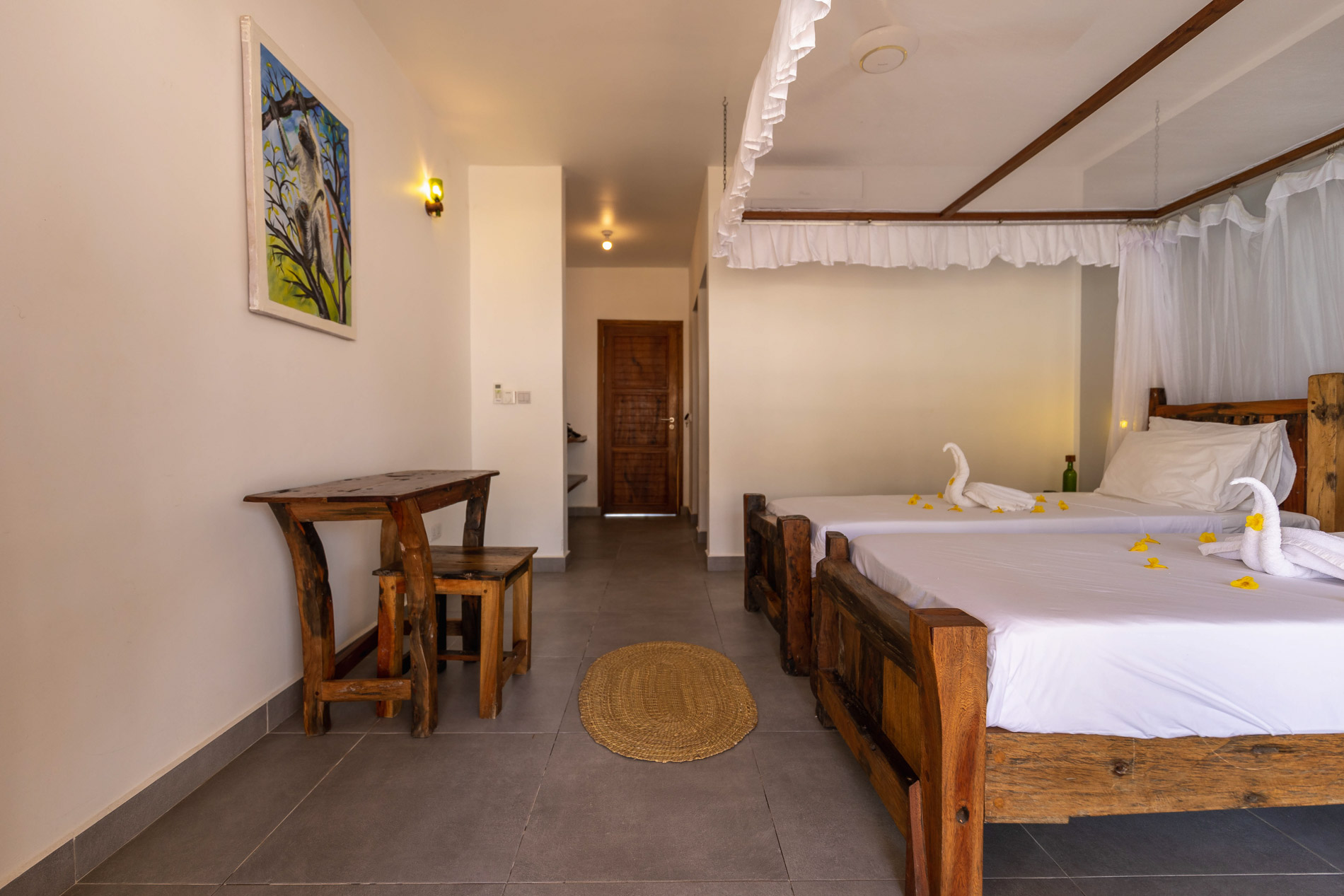 The spacious twin room (28m2) offers air conditioning, fan, a tea and coffee maker, a terrace with garden and pool views, a dinning area, as well as a private bathroom featuring a walk-in shower. All rooms have a safe deposit box and mosquito net and are accessible by stairs only. All rooms are non smoking.
